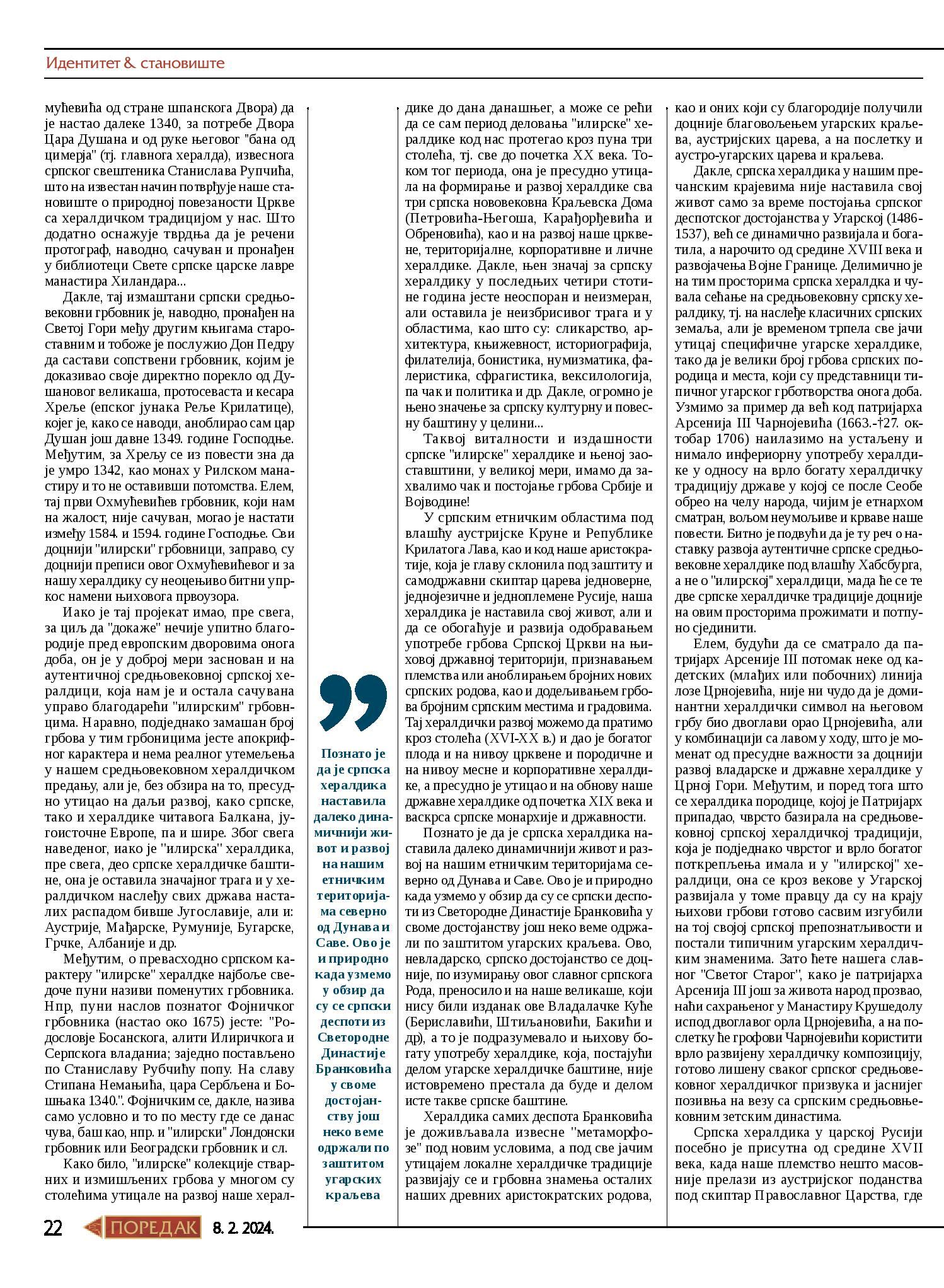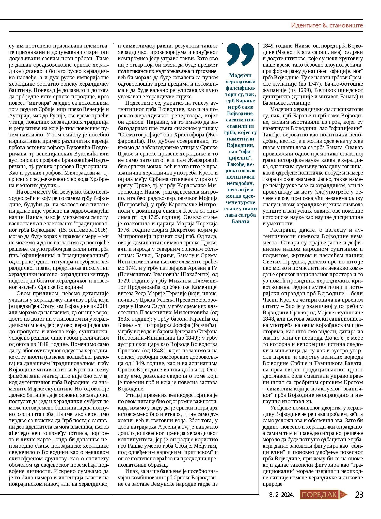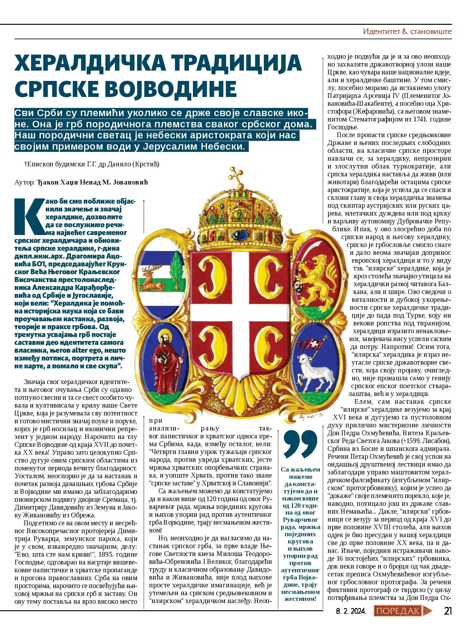 Једанаести број недељника Поредак (8. фебруар 2024) донео је текст из пера секретара Центра за истраживање православног монархизма и председника Одбора за хералдичке и генеалошке студије, ђакона Хаџи Ненада М. Јовановића, а под насловом „Хералдичка традиција Српске Војводине“.